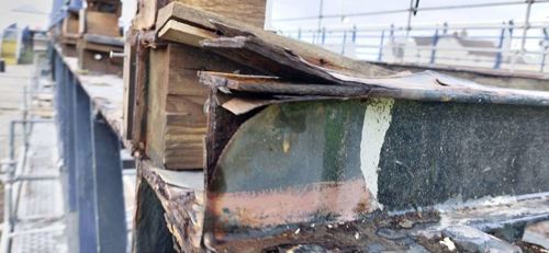 The contractor in 2000 used the wrong screws, wrong wood and installed noggins incorrectly  as well as failing to renew the steelwork and fixings correctly. Shortly after reopening, failure of the coating system and corrosion of the underlying steelwork was identified. Following arbitration, it was agreed that the surface preparation for the recoating works had been inadequate.