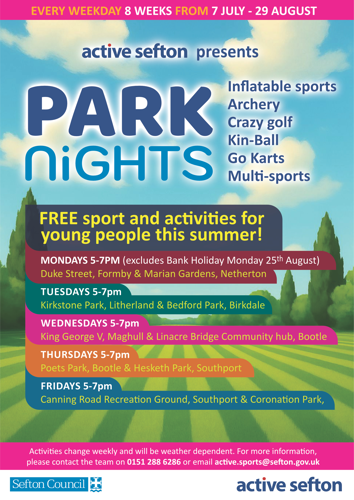 Running every weekday evening from 7th July to 29th August, Park Nights will bring exciting sports and activities to local parks throughout Sefton, giving young people a safe and positive way to spend their summer evenings outdoors.