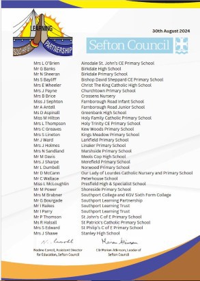 Letters signed by headteachers from the Southport Learning Partnership, the Leader of Sefton Council and the Council’s Assistant Director for Education are being sent to parents and carers of pupils attending schools in Southport ahead of next week’s start to the new academic year.
