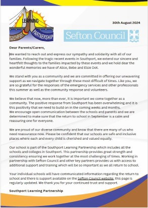 Letter sent to parents and carers of Southport schools pupils